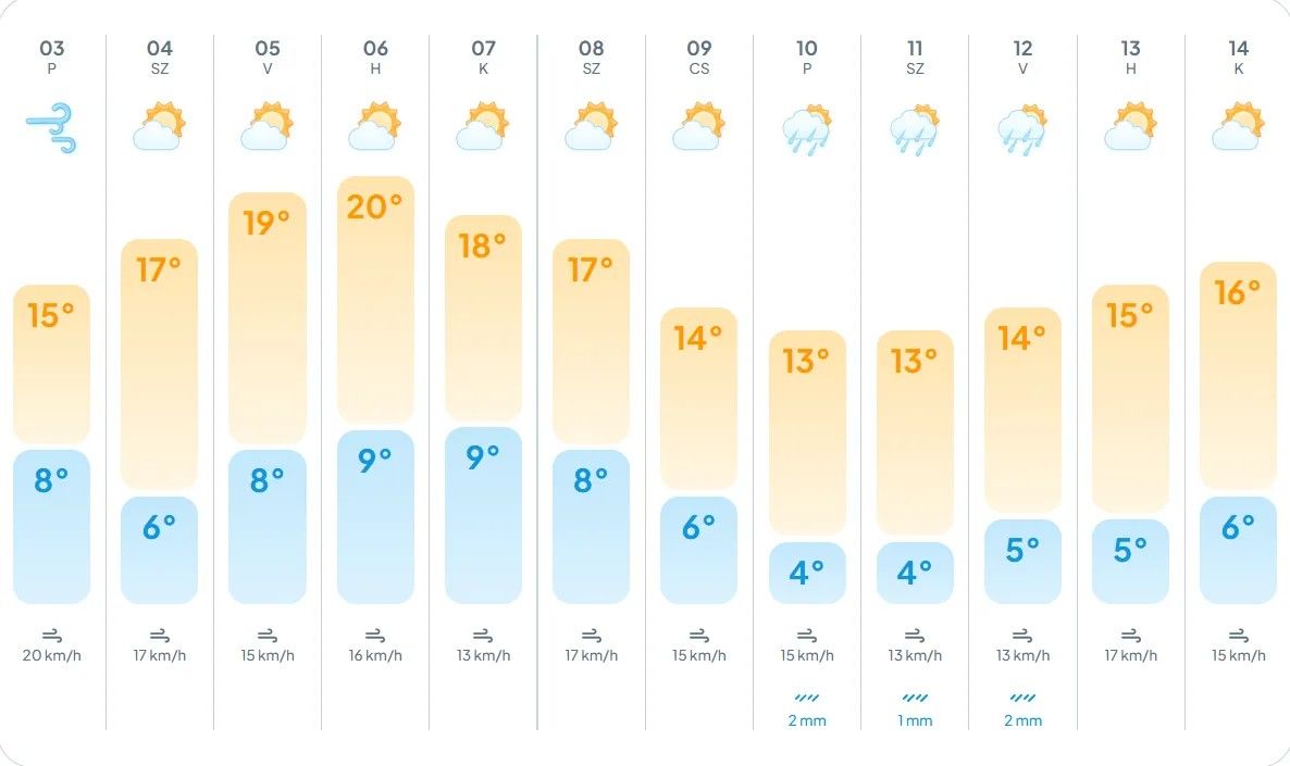 Húsvét hétfőn, április 6-án, változékonyabb időjárásra készülhetünk. Északnyugat felől vastagabb felhők érkeznek, és elszórtan záporok is előfordulhatnak, különösen északon. A szél ismét megerősödhet, északnyugati irányból fújva, de a hőmérséklet továbbra is 20 fok közelében marad, így a nap nem lesz hideg.