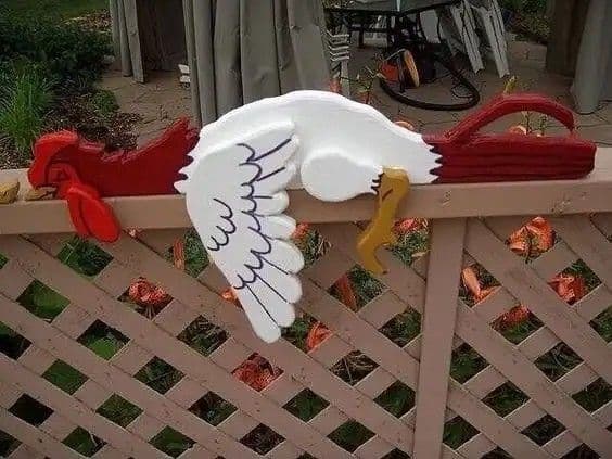 A kerítés mentén is elhelyezhetsz vicces figurákat, például egy arany taréjú, pihenő kakast, ami életet visz a környezetbe.