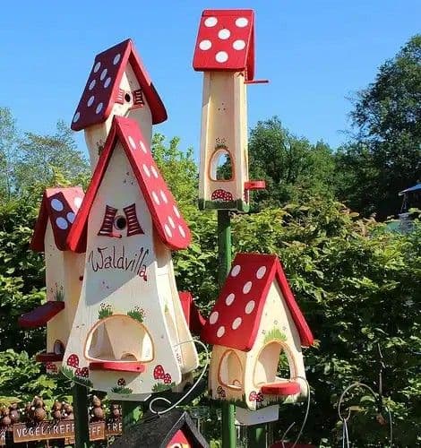 A málnabokrok közé elhelyezett mókás madáretetők nemcsak a madaraknak, hanem a kert látogatóinak is örömet okoznak.