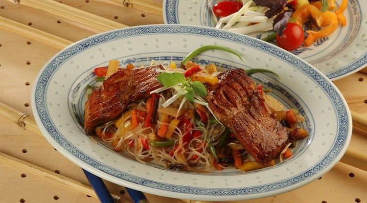 - Forró olajon megpirítjuk a cukrot, hozzáadjuk a zöldséget a levével együtt, majd a szójaszószt és szezámmag-olajat is hozzáöntjük, és roppanósra pároljuk. Végül belekeverjük a tésztát.