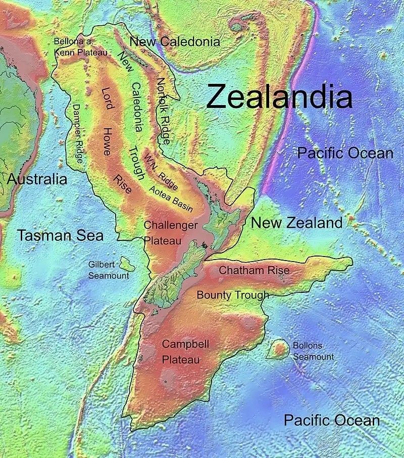 A Google Térképen jól látható, hogy Új-Zéland körül sekély víz található, ami inkább egy self-zónára, mintsem elszórt vulkanikus hegyvonulatokra emlékeztet. Tengerfenék-vizsgálatok során olyan szintkülönbségeket találtak, amelyek elsüllyedt folyómedrekre utalnak.