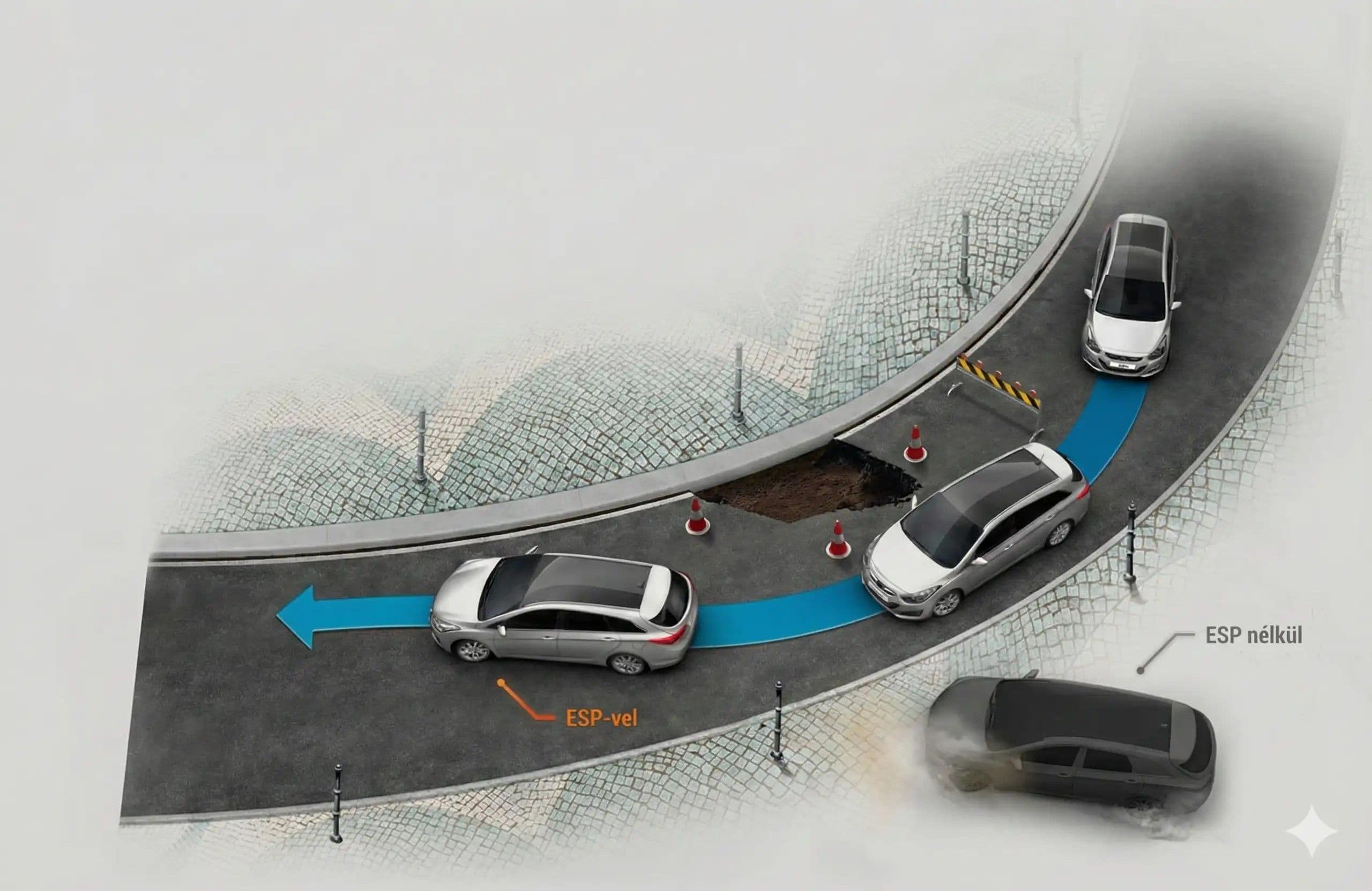 Az ESP szenzorai folyamatosan figyelik a jármű mozgását, beleértve a kormányzási szöget és a keréksebességet. Ha az autó irányt veszt, például alulkormányzottság esetén, a rendszer beavatkozik, és segít visszaállítani a pályára.