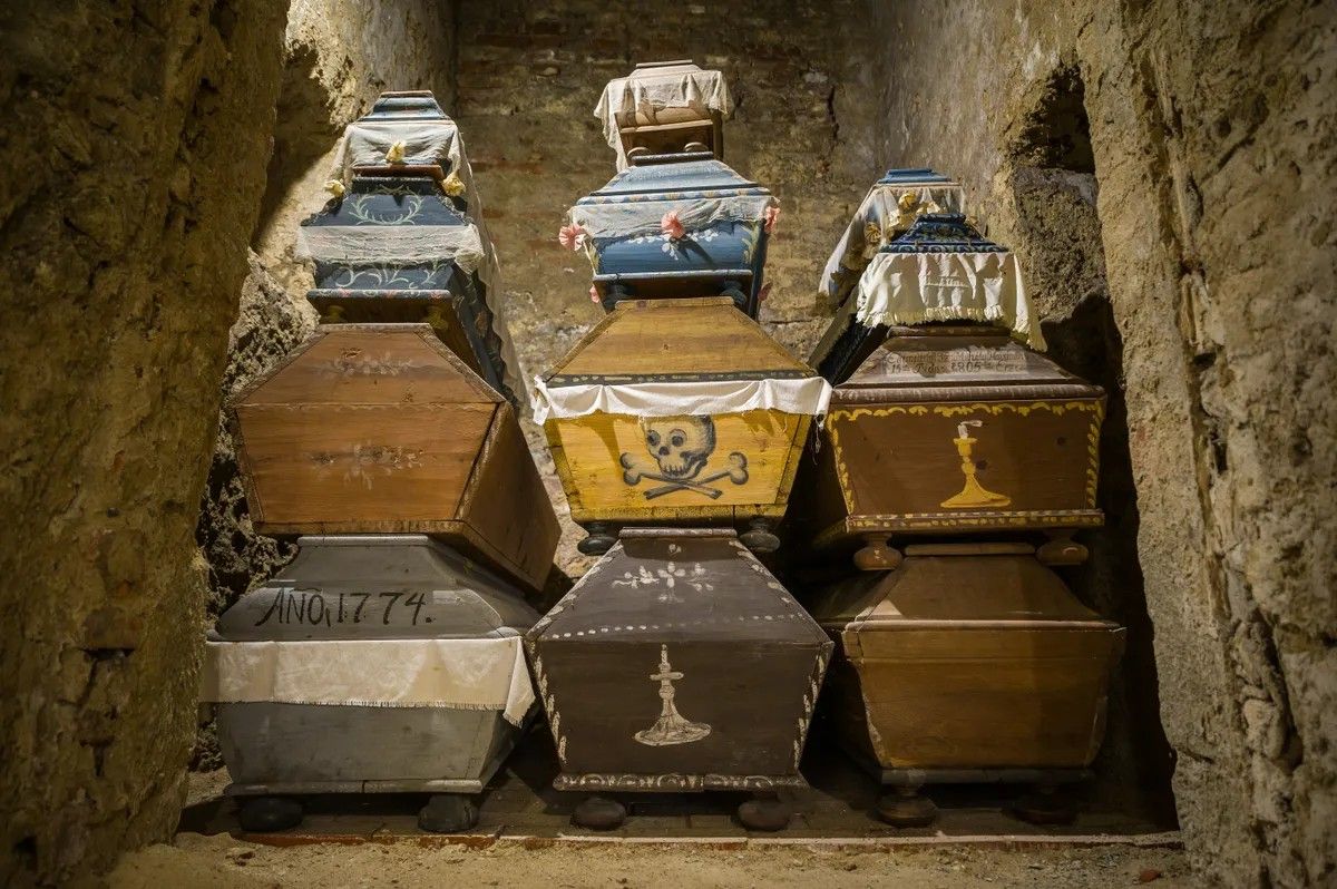 A kriptában egyedi mikroklíma segítette a testek természetes mumifikálódását, ahol a koporsókban fekvő holttestek megőrizték eredeti formájukat. Ezek a koporsók a város jómódú polgárait és egyházi személyeket rejtettek, akik a különleges körülményeknek köszönhetően fennmaradtak.