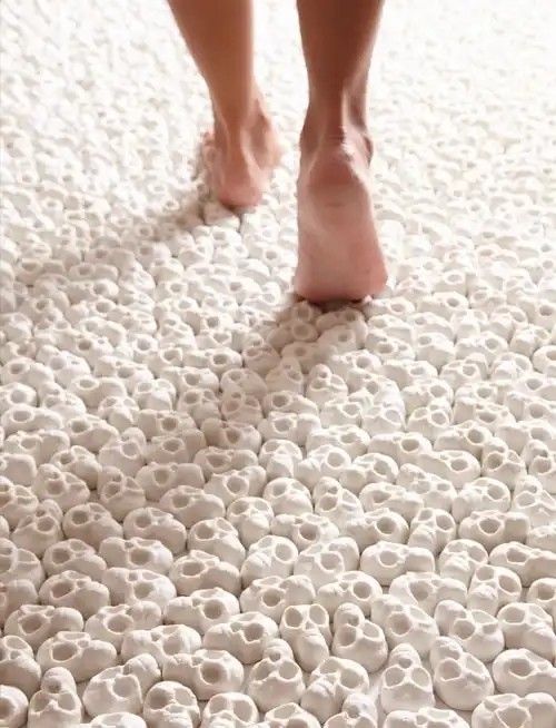 Nino Sarabutra thai művész egyedi kerámia koponya installációja, amely 10 ezer darabból áll, kérdéseket vet fel az élet értelméről. Bár elsősorban művészeti alkotás, nem kizárt, hogy valaki otthonában is alkalmazza padlóburkolatként.