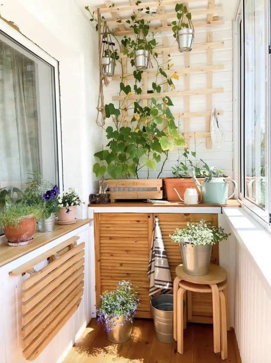 Egy aprócska balkon is lehet praktikus és stílusos. Például egy egyszerű deszka asztalként szolgálhat, míg a láda tároló és ülőhely funkciót is betölthet. A zseniális dolgok néha valóban a legegyszerűbbek.