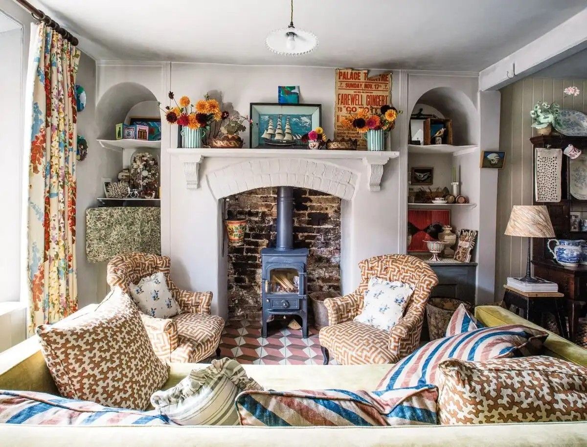 A nappaliban található kandalló korábban befalazva volt, de Libby újraélesztette az élő tűz varázsát, ami a helyiség központi elemévé vált. Az alábbi fotón látható, hogy milyen változások történtek itt az évek során.