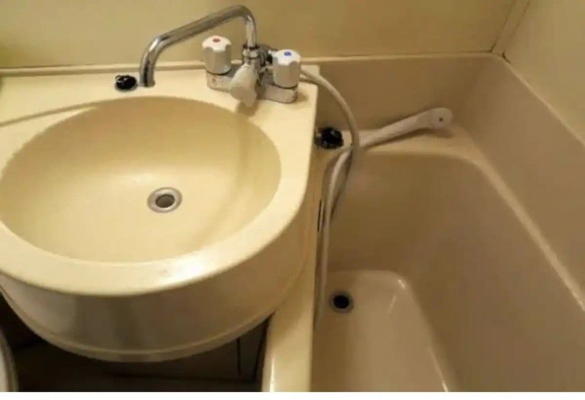 A fürdőszoba mérete egy repülőgép mosdójára emlékeztet, ahol a mosdó és a zuhanyzó egyetlen csapból nyer vizet. Ez a kis helyiség is tükrözi a japán hatékony térkihasználást.
