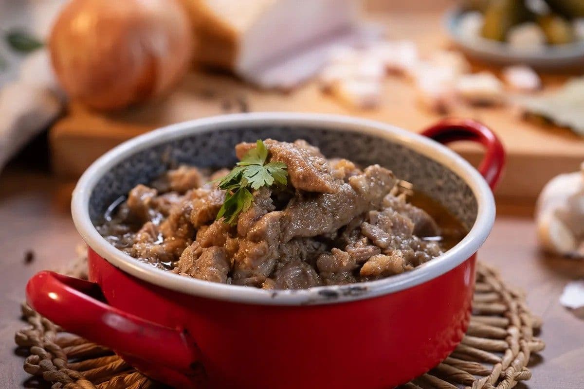 Az elkészítés során a sertéstarját és a füstölt szalonnát használjuk, melyek együtt egy különleges ízkombinációt alkotnak. A hagyma és fokhagyma alapot ad az ételnek, amit különféle fűszerekkel, mint a bors, majoránna és kömény ízesítünk. Végül a fehérbor teszi teljessé a fogás ízvilágát, amit lassú tűzön főzünk puhára.
