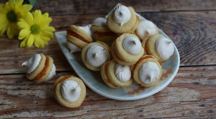A tojásfehérjéket verjük kemény habbá, adjuk hozzá a porcukrot. A habot töltsük habzsákba, és a tészták tetejére halmozzuk. Süssük 8-10 percig, amíg a hab aranybarnára pirul. A kihűlt tésztákat ragasszuk össze a sima felületükön lekvárral.