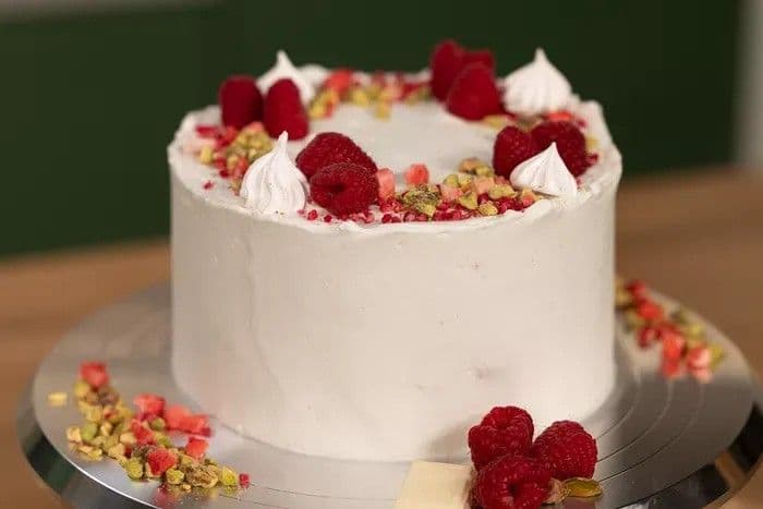 7. Díszítsd a tortát liofilizált málnával, pisztáciával és habcsókkal.