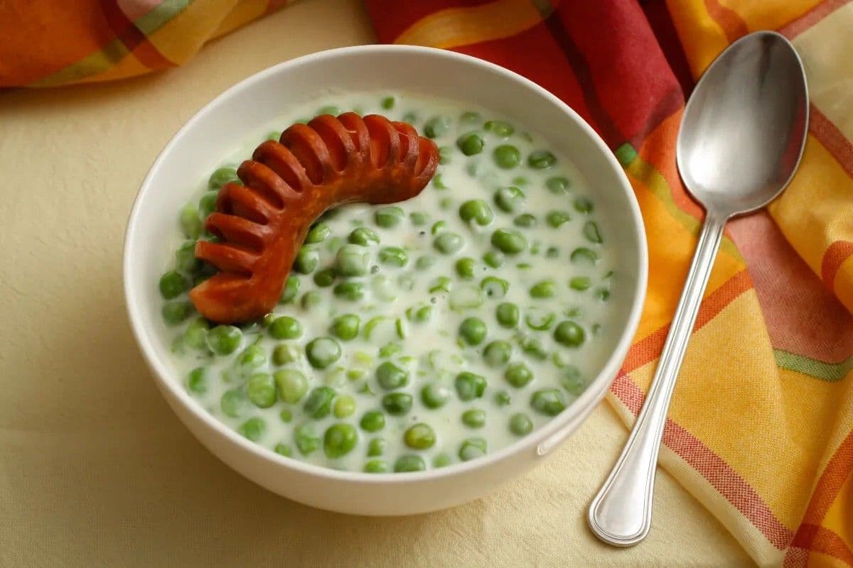 A zöldborsófőzelék kiválóan párosítható fasírttal, sült virslivel vagy tükörtojással, így igazán laktató és ízletes fogást kapunk. Az alábbi kép is ezt a finomságot ábrázolja, ami a magyar konyha egyik kedvelt étele.