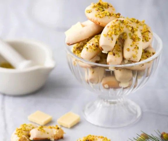 A sütik díszítéséhez a fehér csokoládét olajjal együtt gőz fölött megolvasztjuk. Ebbe mártjuk a kihűlt kifliket, majd pisztáciával szórjuk meg őket. Hagyjuk, hogy a csokoládébevonat megszilárduljon, és máris élvezhetjük az ízletes süteményeket.