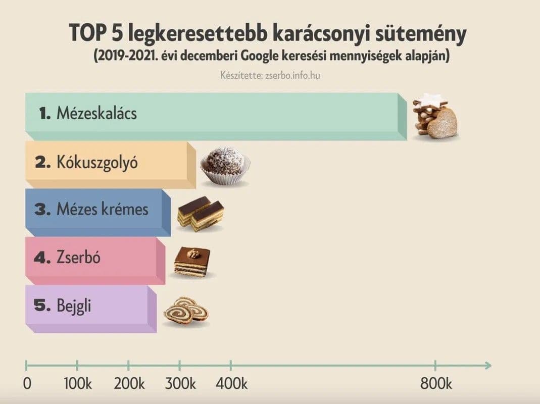 A zserbó szorosan követi a dobogósokat, és a magyarok körében továbbra is az egyik kedvenc sütemény. Bár a bejgli népszerűsége évről évre csökken, még mindig az ötödik helyen áll a keresési adatok alapján. Ugyanakkor olyan sütemények, mint a hókifli, tiramisu és mákos guba, hamarosan a bejgli helyébe léphetnek a rangsorban.