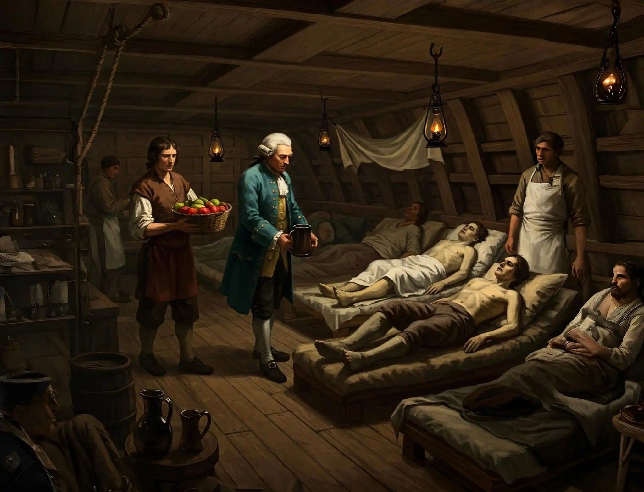 James Lind hajóorvos a Földközi-tengeren végzett kísérletei során 12 skorbutos beteget kezelve jött rá a gyümölcsök gyógyító hatására. A betegeket különböző "gyógyszerekkel" kezelte, és azok, akik gyümölcsöt kaptak, felépültek. Ebből következtetett arra, hogy a sav és a sós víz nem hatásos.