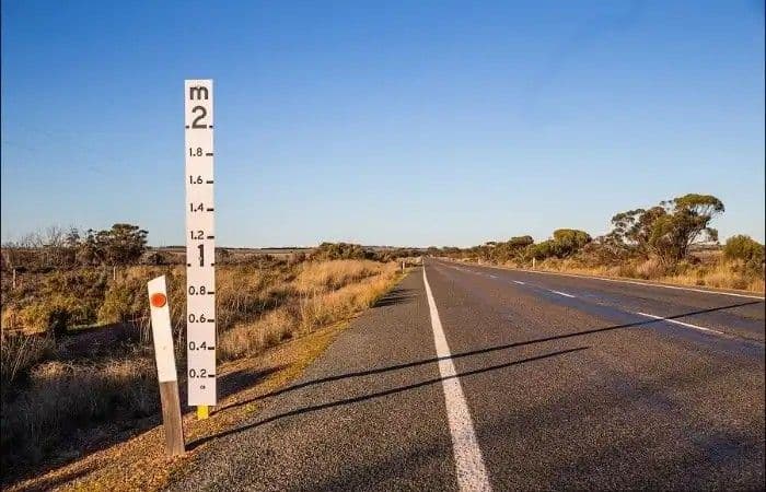 Az ausztrál főutak mentén található óriási mérőlécek nemcsak az esőzések során, hanem a turisták számára is különleges látványosságot jelentenek. Ezek a mérőeszközök, bár elsőre furcsának tűnhetnek, valójában fontos szerepet játszanak az árvizek során. Az alábbi képen ezek közül látható egy.
